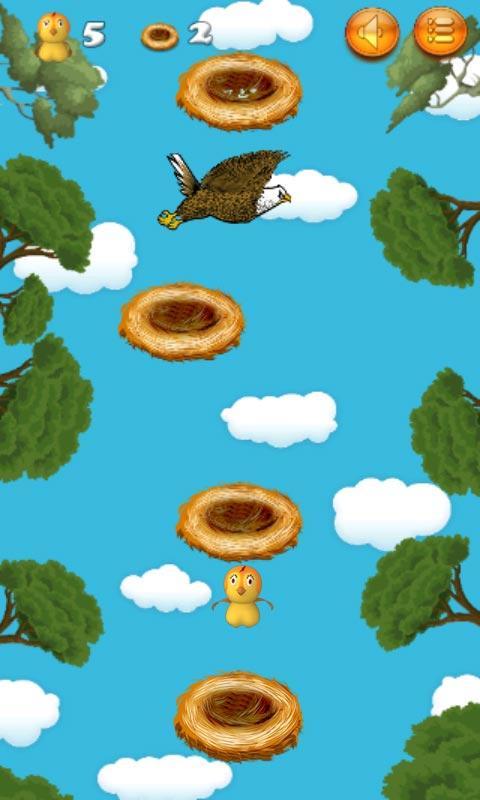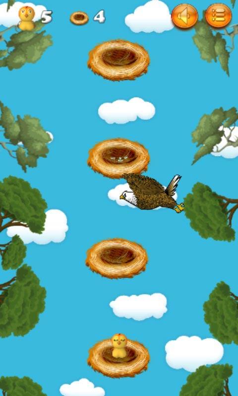 Mais méfiez-vous !!! Lorsque vous la formez, ce jeu amusant d'espoir de nid à nid pourrait être mortel. Il n'y a pas de chasseur mais il y a un aigle affamé, à la recherche d'une proie. Il plane partout dans la forêt et garde un œil sur chaque instant de l'oiseau de poussin. L'oiseau de poussin manque le nid et Eagle va la serrer dans son bec fort.